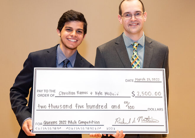 Meeting the needs of financially vulnerable college students, improving consumer experience through innovative technology, and offering a more sustainable route for the production of biodiesel. These lofty aims are what the three finalists in the 2022 Queens Annual Pitch Competition set out to achieve through their five-minute presentations and business proposals. Although the finalists were vying for their share of $5,000 in total prize money, the competitors seemed to be just as motivated by the mentorship and comradery of the process. Juniors Kyle McGuff ’23 and Christian Ramos ’23 won first place for their proposed product; Alkalyst, a novel alkaline catalyst solution to encourage more sustainability in the production of biodiesel.