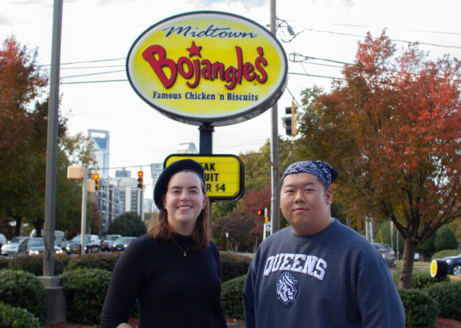Graphic design students Nathan Le ’24 and Izzy Jones ’24 were thrilled to take part in the creation of a new mural on E Third Street near uptown. The North Carolina natives credit their Queens professors with opening the door for the design partnership with Bojangles and the Carolina Panthers.