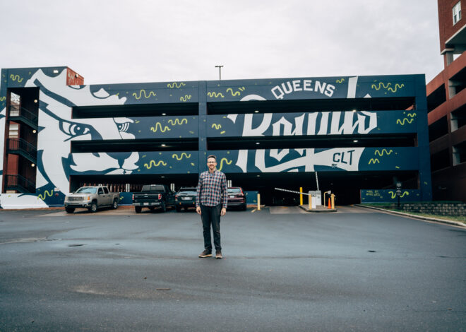 Mike Wirth, associate professor in the art, design, and music department, recently completed one of the largest art installments on the Queens campus. The towering mural, spanning 3,800 square feet, consists of vibrant colors and is located at the entrance to the North Deck Staff Parking Garage. The mural took 11 days to complete and required about 75 hours of active painting.