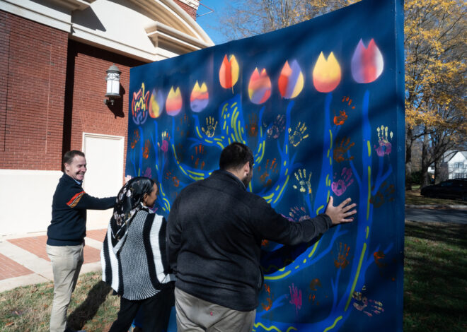 “The idea for the murals was for it to be a window into the work we do at Queens. The Menorah Tree facing into campus, topped with the lights from our diversity clubs, represents the growing together and nurturing that Queens fosters for its students,” said Snyder. “The Peace Pom, facing away from campus, is supposed to be what the greater Charlotte area sees when they look at Queens and the work we’ve been doing to create unity.”